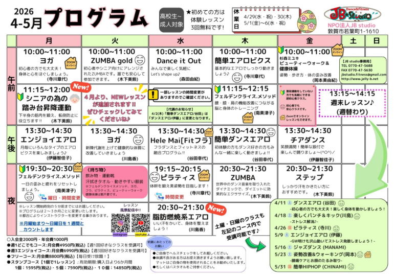 | 4/11(土)ダンスエアロ(谷田) 4/18(土)楽しくパンチ&キック(川島) 4/26(日)ピラティス(寺川) 5/9(土)エンジョイエアロ(伊藤) 5/16(土)ジャズダンス(MANAMI) 5/23(土)姿勢改善とウォーキング(岡本) 5/31(日)簡単HIPHOP(CHINAMI) |