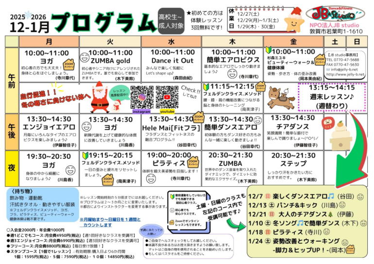| 12/7(日) 楽しくダンスエアロ(谷田) 12/13(土) パンチ&キック(川島) 12/21(日) 大人のチアダンス(伊藤) 1/10(土)冬ソングで簡単ダンス(木下) 1/18(日) ピラティス(寺川) 1/24(土) 姿勢改善とウォーキング -脚力&ヒップUP!(岡本) |